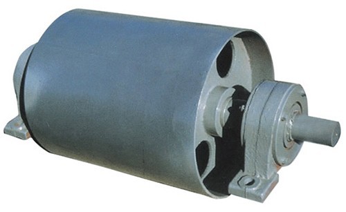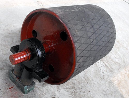 傳動滾筒是輸送機傳遞動力的部件。其驅(qū)動帶式輸送機的方式有單滾筒、雙滾筒及多滾筒之分。單滾筒多用于功率不太大的輸送機上,如煤礦地面運輸及選煤廠等處。井下帶式輸送機一般均采用雙滾筒,以使輸送機結(jié)構(gòu)緊湊。傳動滾筒表面有裸露光鋼面,人字形和菱形花紋橡膠覆面。小功率、小帶寬及環(huán)境干燥時可采用裸露光鋼面。人字形花紋膠面摩擦系數(shù)大,防滑性和排水性好,但有方向性。菱形膠面用于雙向運行的輸送機。